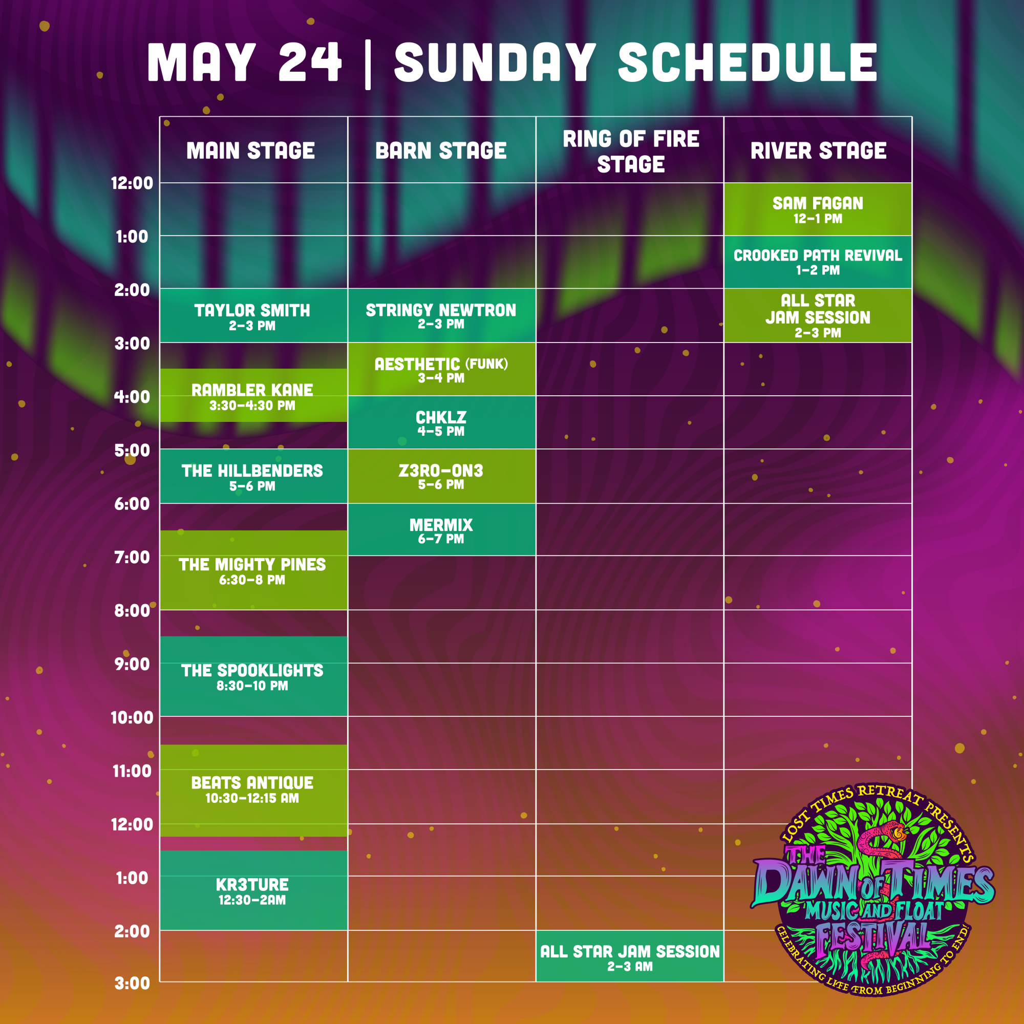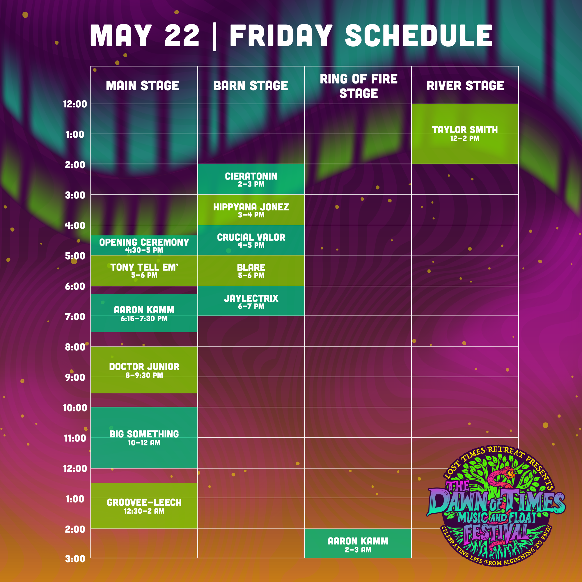 Join us for three unforgettable nights of camping and FUN at the Lost Times Retreat! Come celebrate a new season with us & enjoy a legendary music lineup of national touring and regional multi genre artist! Also enjoy canoeing, hiking, swimming, art, GREAT local food & craft vendors, a wide variety of workshops, late night bonfire jams and so much more… All on top of the Ozark Mountains right next to the majestic Buffalo River located in Jasper AR.
